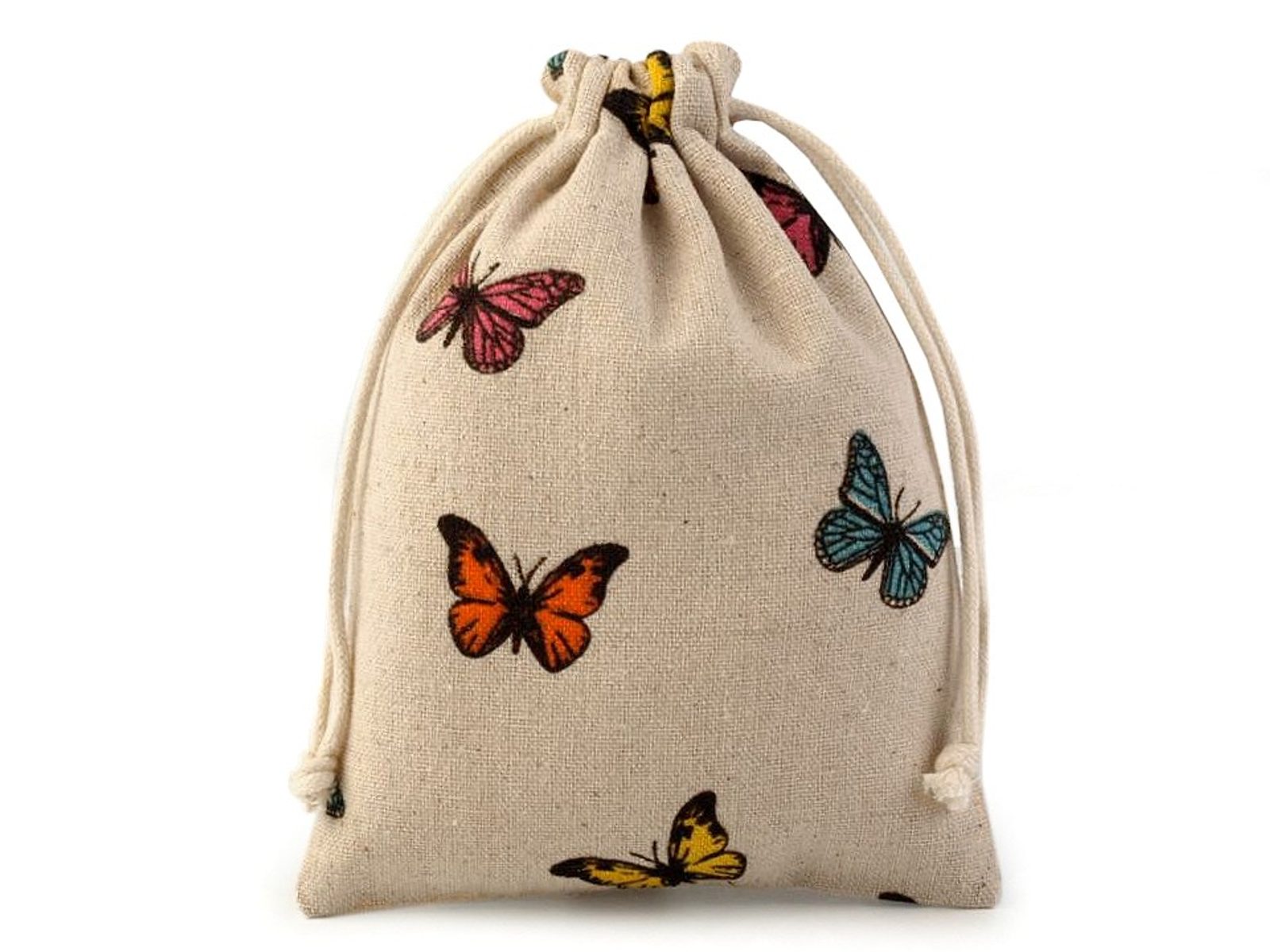 Přírodní lněný pytlík zdobí veselý potisk barevných motýlů. Je kvalitní a pevný. Snadno se uzavírá pomocí dvou bavlněných stahovacích šňůrek.