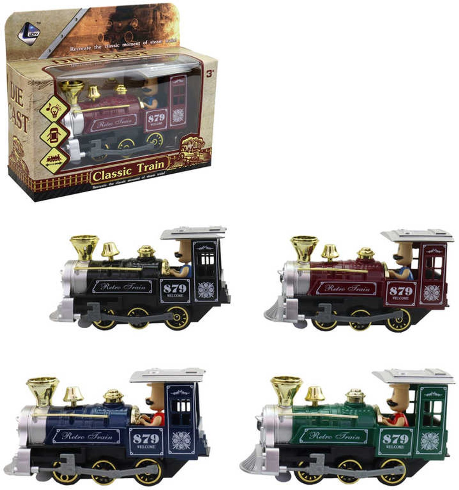 Lokomotiva parní retro vláček zpětný chod na baterie Světlo Zvuk 4 barvy kov