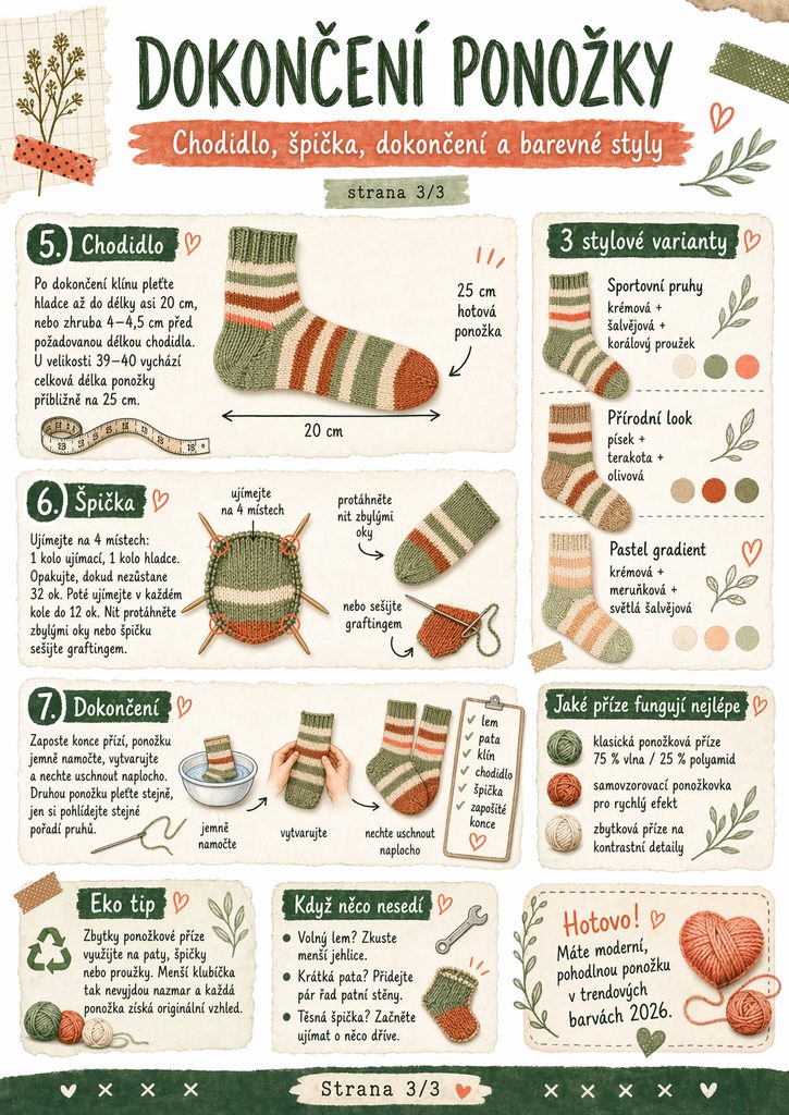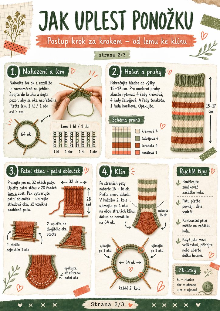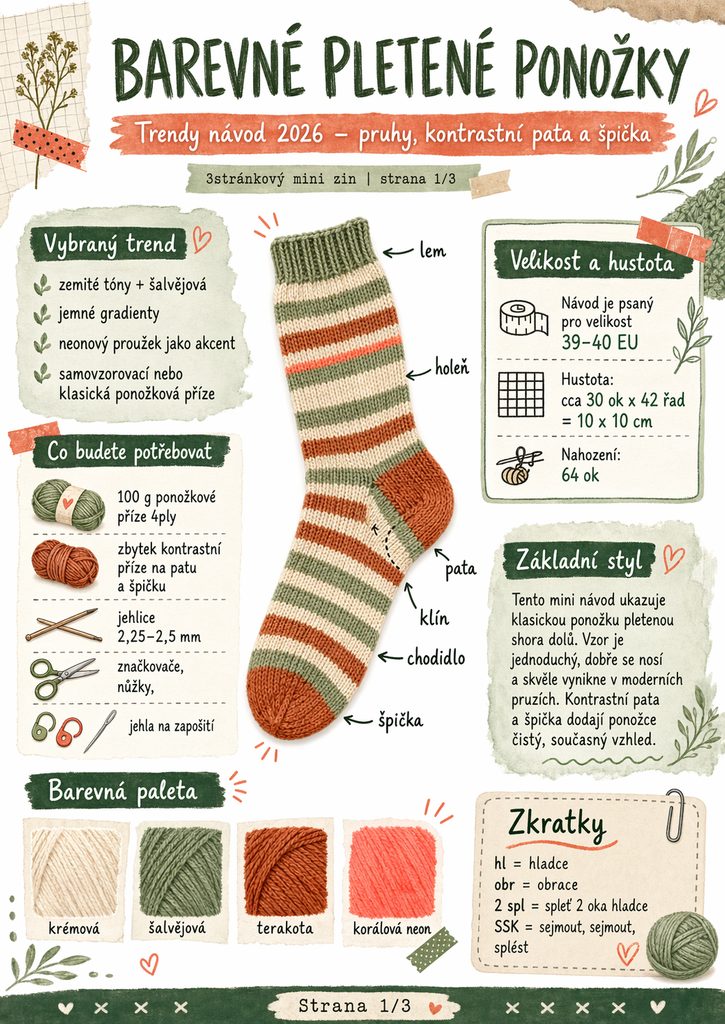 Pletené ponožky už dávno nejsou jen „něco do zásuvky na zimu“. V roce 2026 se v pletení výrazně prosazují zemité odstíny, šalvějová zelená, jemné gradienty a také výrazný akcentní proužek v kontrastní barvě. Vedle toho se v knitwearu dál drží přírodní palety a současně i drobné neonové prvky, které oživují jinak klidné kombinace. Právě proto jsme pro tento třístránkový návod zvolili ponožku s pruhy, kontrastní patou a špičkou v odstínech krémové, šalvějové, terakoty a korálového akcentu.
