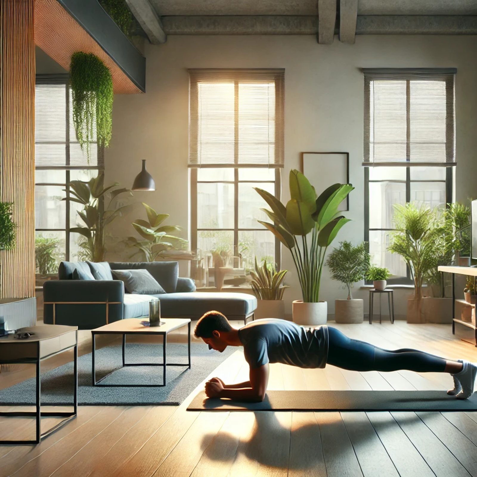 Plank (2 minuty): Podepřete se na předloktí a špičkách nohou, tělo držte v rovině. Snažte se vydržet celou minutu.