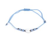 Zapínání je posuvné, oba konce náramku procházejí středovým uzlem, který umožňuje utažení šňůrek. Náramek má univerzální velikost.