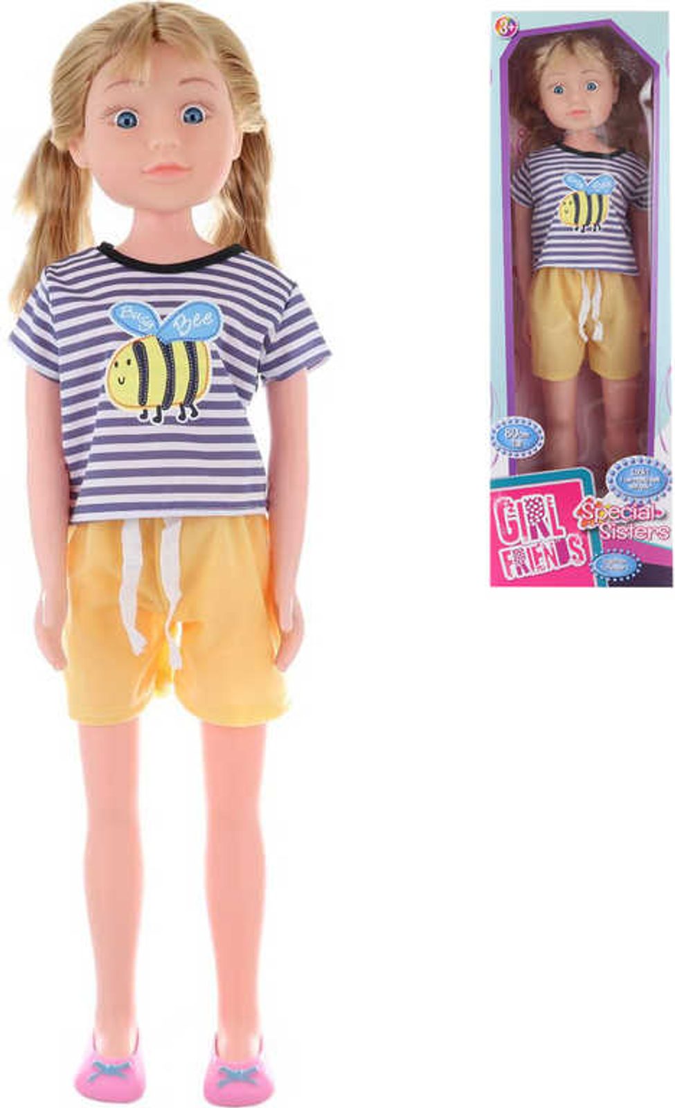 Krásná velká panenka s vlásky do copánků. Panenka má pohyblivé nohy a ruce, ale kolena pohyblivé nemá. (mechanická funkce - není na baterie - panenka se sama neudrží bez pomoci). Baleno v krabici.
