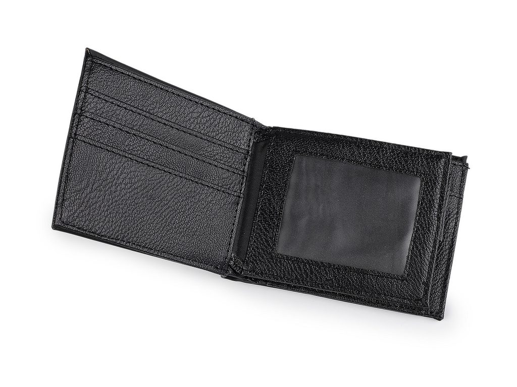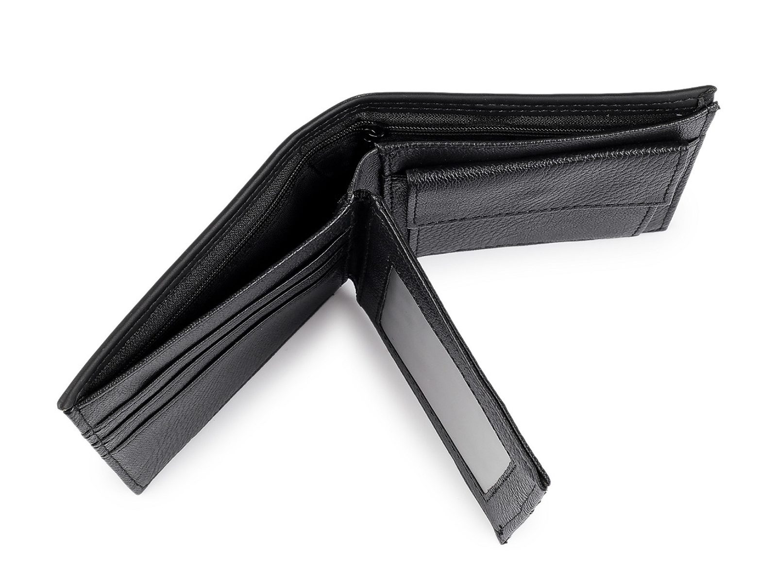 Peněženka má 7 přihrádek na kreditní karty, z toho jsou 2 průhledné. Vzadu jsou 2 dlouhé přihrádky na rozložené bankovky, jedna z nich je na zip. Mincovník má tvar rozkládací kapsy, zapíná se na klopu na patentku.