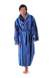 Moderní hřejivý pánský župan plný proužků v odstínech modré barvy. Župan se šálovým límcem Joe je vyroben z huňatého a teplého materiálu. Župan se šálovým límcem, kapsami a zavazováním v pase.
