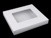 Obdélníková papírová krabice má výřez ve víku z průhledné fólie. Povrch bílé krabice je lesklý. Využijete ji na balení dárků, šátků, uložení drobných baněk apod. Můžete si ji i dozdobit podle svého vkusu.