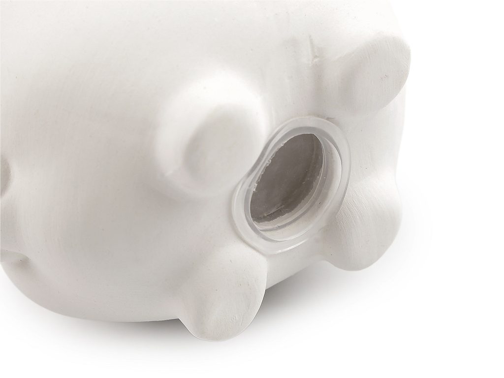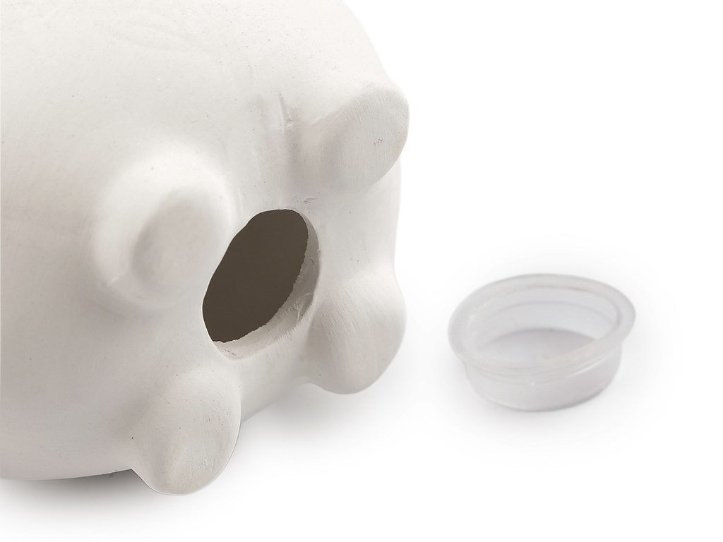Dole je v pokladničce kulatý otvor, který se uzavírá pomocí plastové zátky. Pokladnička se dá kdykoliv otevřít. Průměr otvoru je 3 cm.