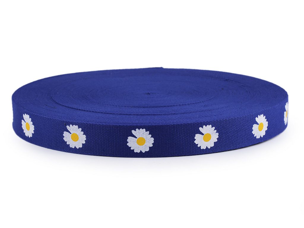 Popruh s potiskem květů najde své uplatnění jako ucho na batohy či tašky. Je vhodný také na výplety nábytku, lehátek, saní, lemování textilních výrobků atd.