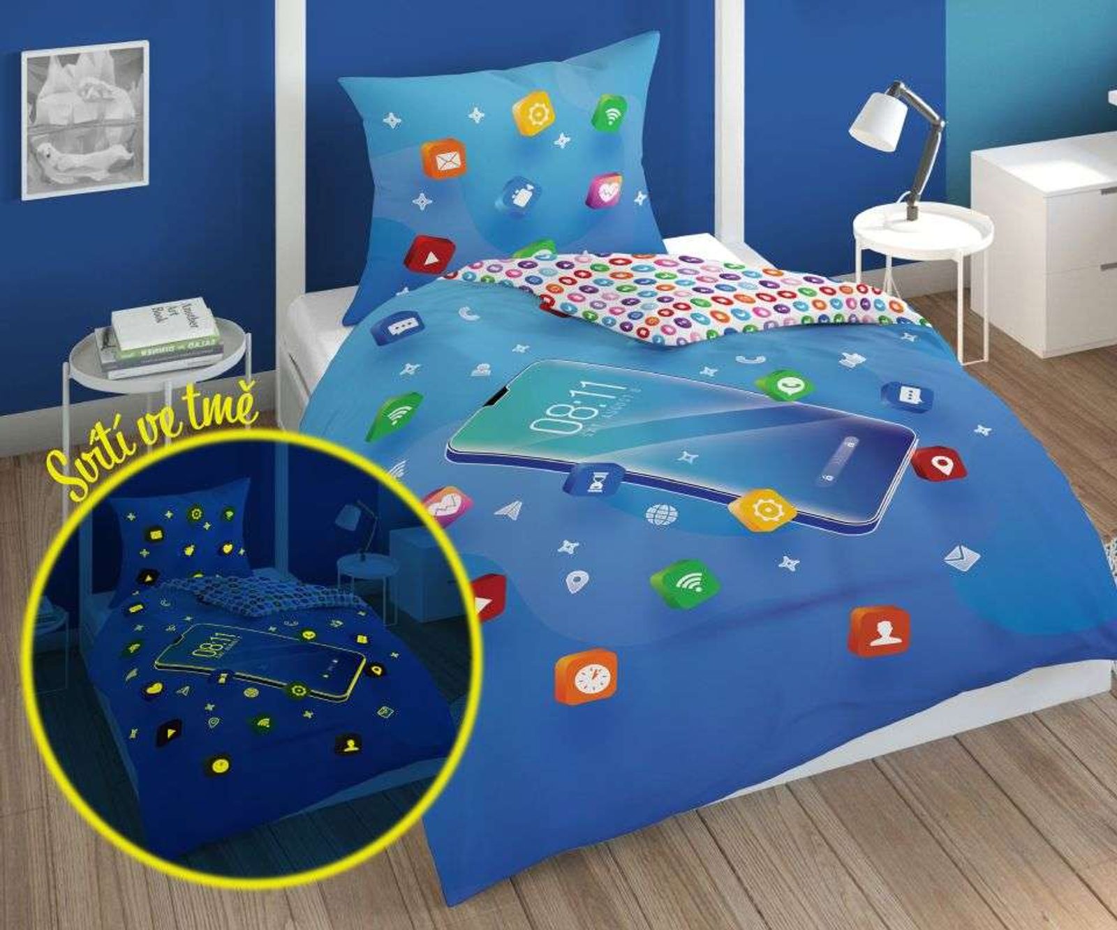 Povlečení Telefon blue svítící Bavlna, 140/200, 70/80 cm
