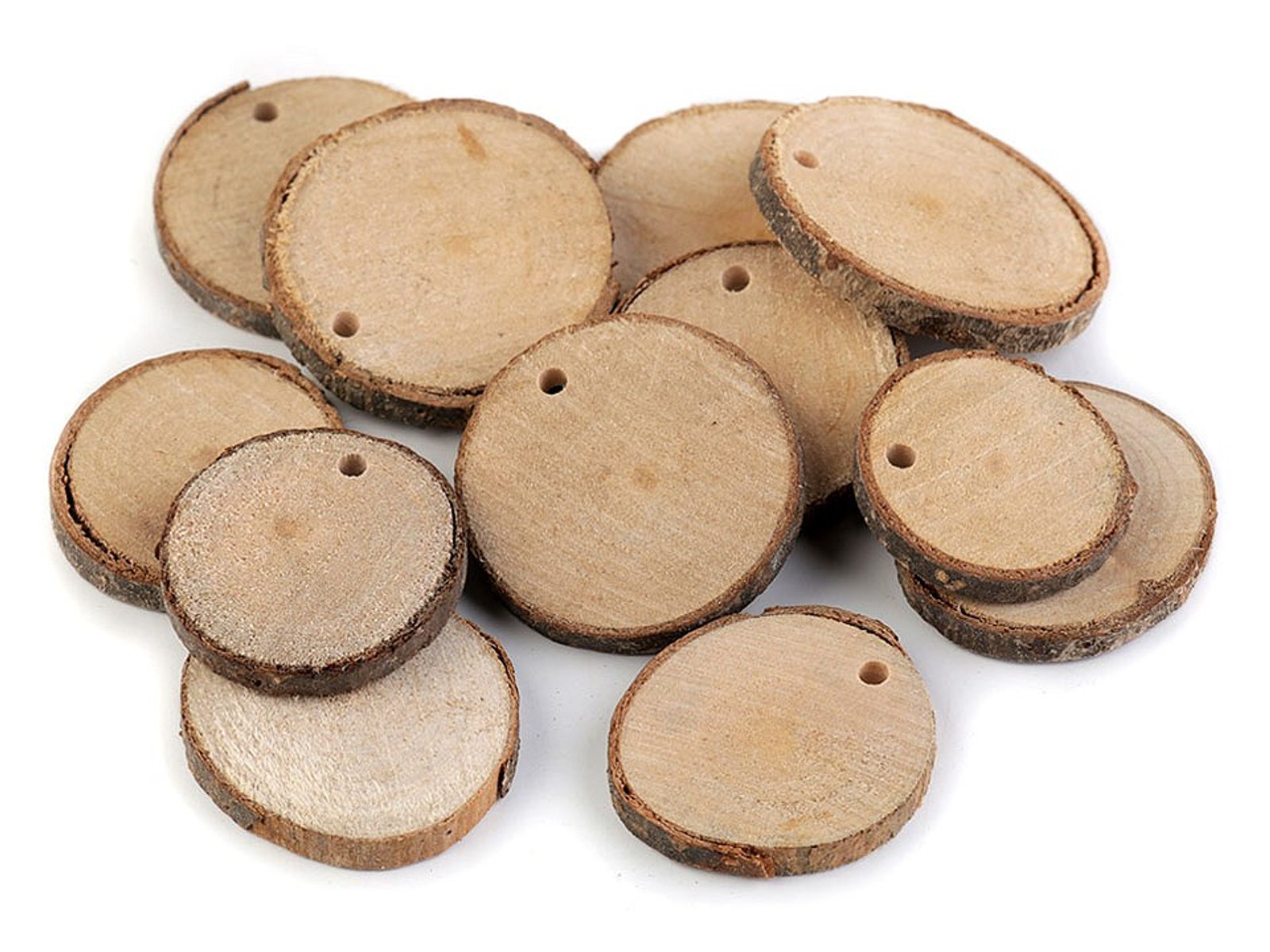 Přírodní dřevěný přívěsek se hodí k dalšímu dotvoření. Je rovný, nahoře má otvor k zavěšení. Není barvený ani lakovaný, každý kus se může lišit jak barvou, tak kresbou dřeva. V balení mohou být přívěsky s kůrou i bez kůry.