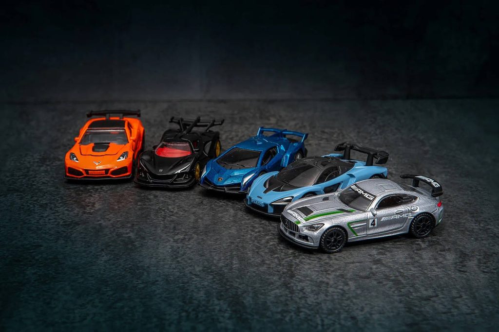 Tato sada 5-ti detailních modelů autíček s pogumovanými pneumatikami obsahuje: Lamborghini Veneno se stříbrnými sportovními koly, Apollo Intenza Emotione v matném černém laku a otevíratelnými dveřmi typu gullwing, Chevrolet Corvette ZR1 s otevírací kapotou, McLaren Senna s detailními ráfky a Mercedes-AMG GT4 s mohutným zadním křídlem. Autíčka jsou vyrobeny z kovových a plastových dílů. Ekologicky baleno z recyklovatelného kartonu bez plastů.