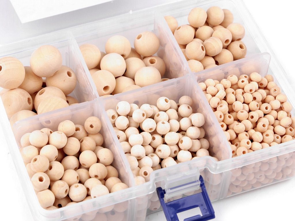 Sada dřevěných korálků v praktickém boxu potěší malé i velké korálkářky. Dřevěné korálky mají velké možnosti použití. Jsou velice oblíbené na macrame i v kombinaci s pedigem, své využití najdou i při výrobě lapačů snů. Jejich přírodní nelakovaný povrch můžete upravit např. barevným mořením, které krásně zvýrazní samotné dřevo a jeho letokruhy. Můžete využít i různé typy laků a olejů. Ale není to nutné, korálky jsou zajímavé i v jejich přirozené přírodní podobě. Hodí se i na výrobu náhrdelníků a náramků. Jejich velikou výhodou je lehká hmotnost.