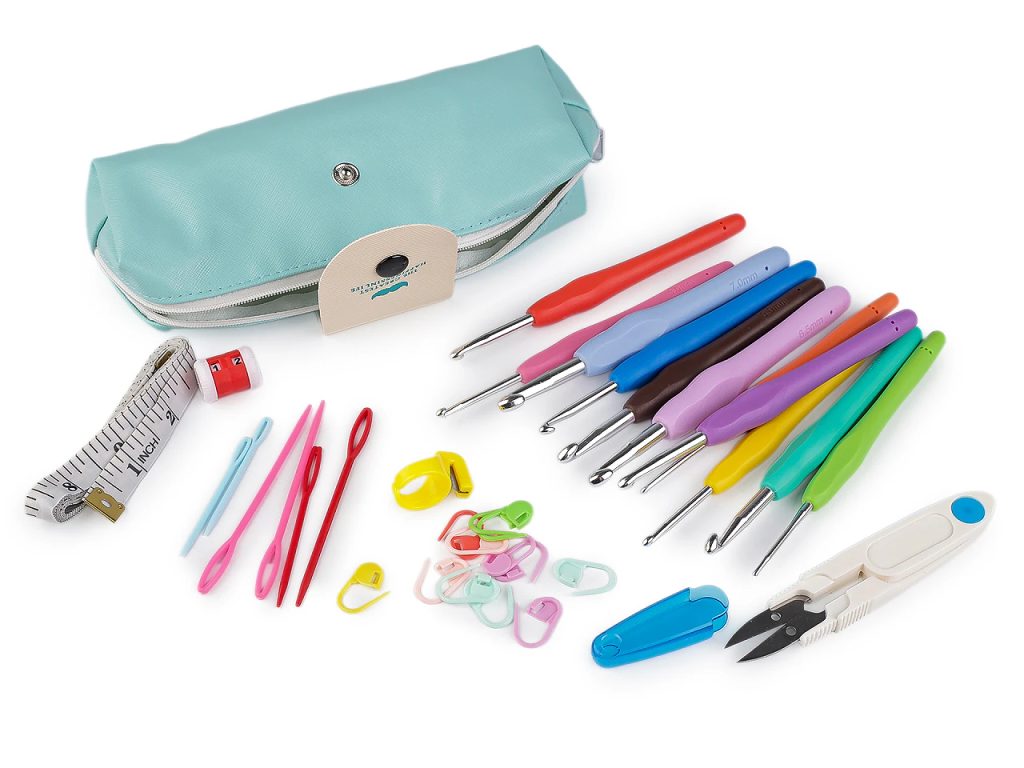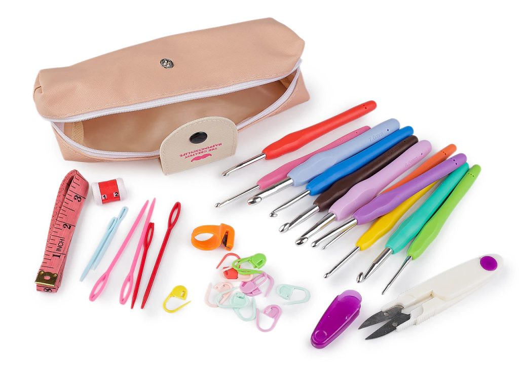 Sada háčků a pomůcek na háčkování v pouzdře