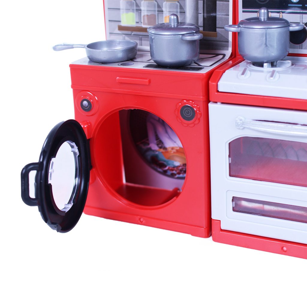 Mini kuchyňská linka se sporákem, mikrovlnkou, skříňkou a pračkou. V sadě také dva hrnce a dvě pánvičky.