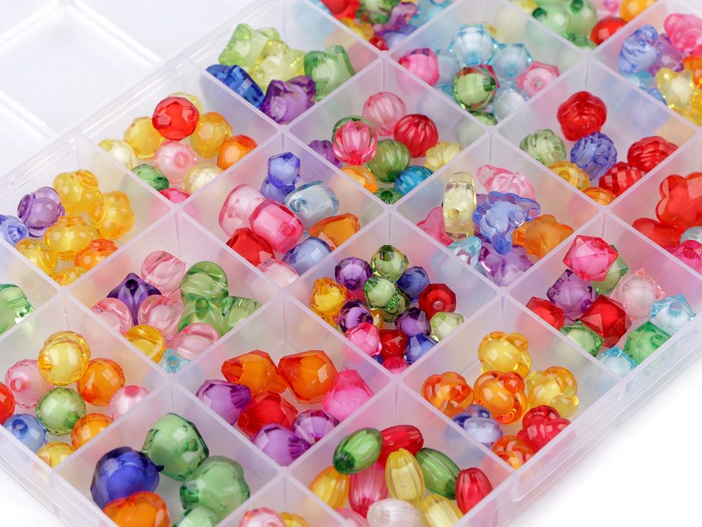 Sada plastových korálků v boxu potěší malé i velké korálkářky. Jsou jedinečné nejen svými různými tvary, ale především jsou zajímavé svou transparentnosti a ploškám, které tvoří velice poutavé světelné odlesky.