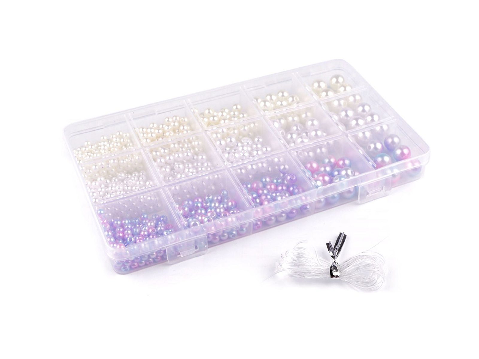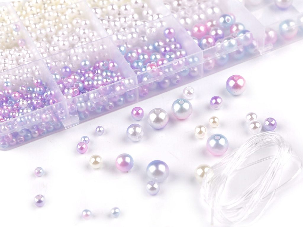 Box obsahuje kulaté korálky s průměrem 4; 5; 6; 8 a 10 mm s průvlekem 1,2 - 2 mm a pruženku dlouhou 1,8 m.