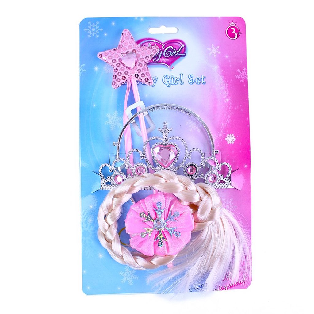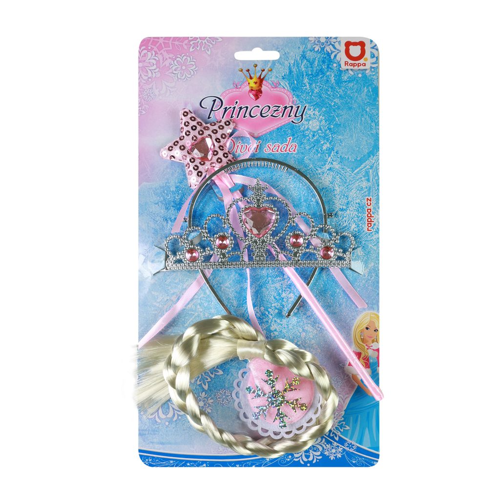 Překrásný set korunky, hůlky a copu pro malé princezny! Korunka je dekorována ozdobnými kamínky v růžové barvě. Délka copu je cca 62 cm