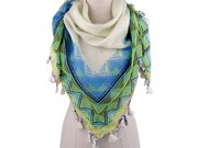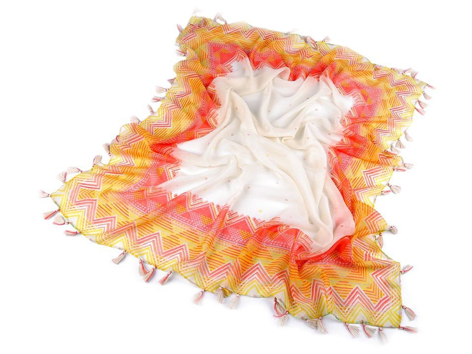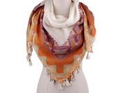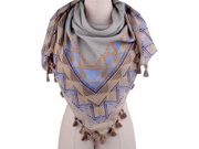 Velký šátek s potiskem indiánské bordury je lehoučký, vyrobený z příjemného materiálu. Ve střední, světlé části má jemné puntíky. Po všech stranách je ozdobený střapci. Šátek je vhodný k nošení po celý rok. Velký čtvercový tvar, můžete variabilně upravit kolem krku.