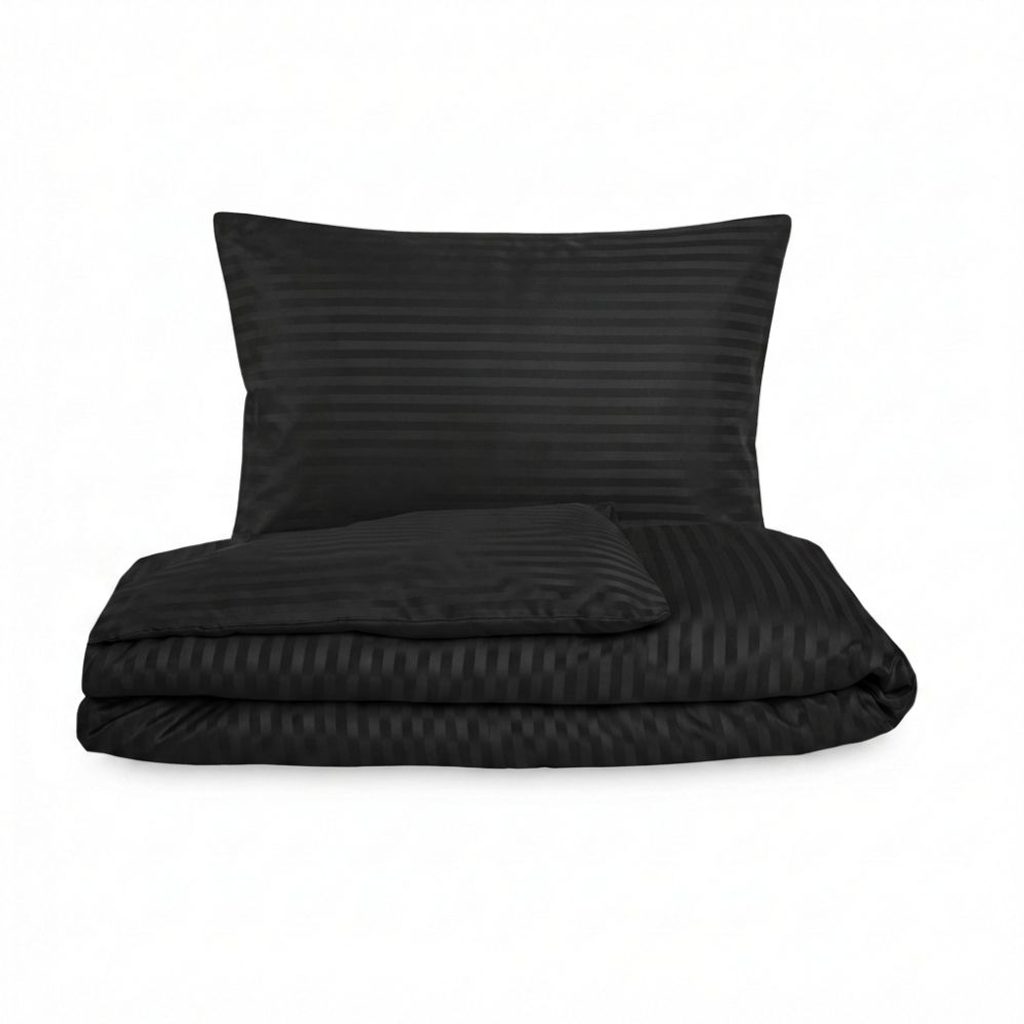 Univerzálnost: Černý satén s proužkem je ideální pro moderní minimalistické interiéry i jako reprezentativní ložní prádlo pro penziony.