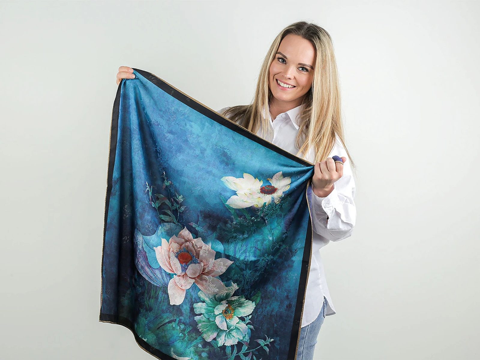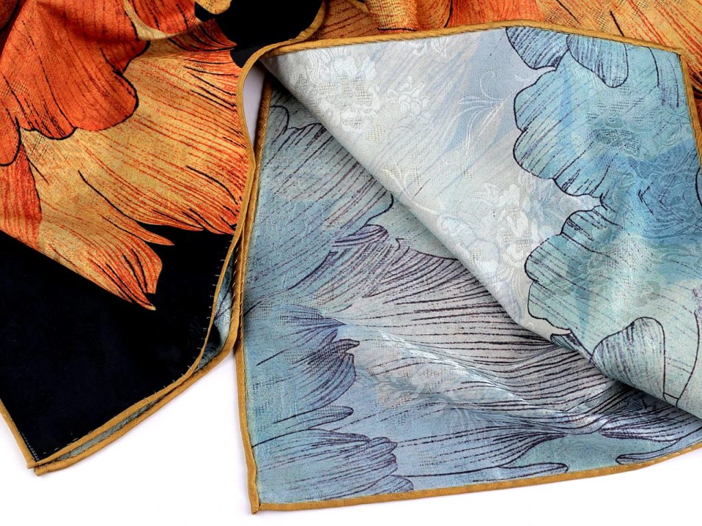 Saténový šátek o rozměru 70 × 70 cm je vyroben z integrovaného polyesteru s povrchovou úpravou silk touch, která mu dodává hedvábný vzhled a příjemnou jemnost na dotek. Díky oboustrannému provedení můžete otočením šátku měnit barevné kombinace nebo využít tón-v-tónu ornamentální vzorek na rubové straně.