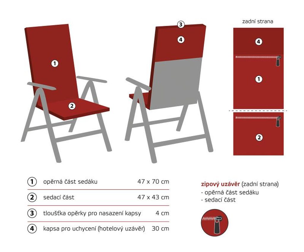Potah na sedák je opatřen zipovým uzávěrem a šev odděluje sedací a opěrnou část. Pro uchycení na židli je potah opatřen hotelovou kapsou (šíře boku 4 cm, délka 30 cm), kterou lehce navléknete na opěrku. Kvalitní materiál zaručí odolnost vůči prosezení. Praní potahu na 40°C, sušení v sušičce nedoporučujeme.