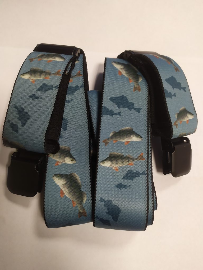 Rybářské a myslivecké šle s potiskem, šíře 4 cm se třemi závěsy, tvar Y, na výšku postavy až 180 cm, maximální délka je 120 cm v nenapnutém stavu.