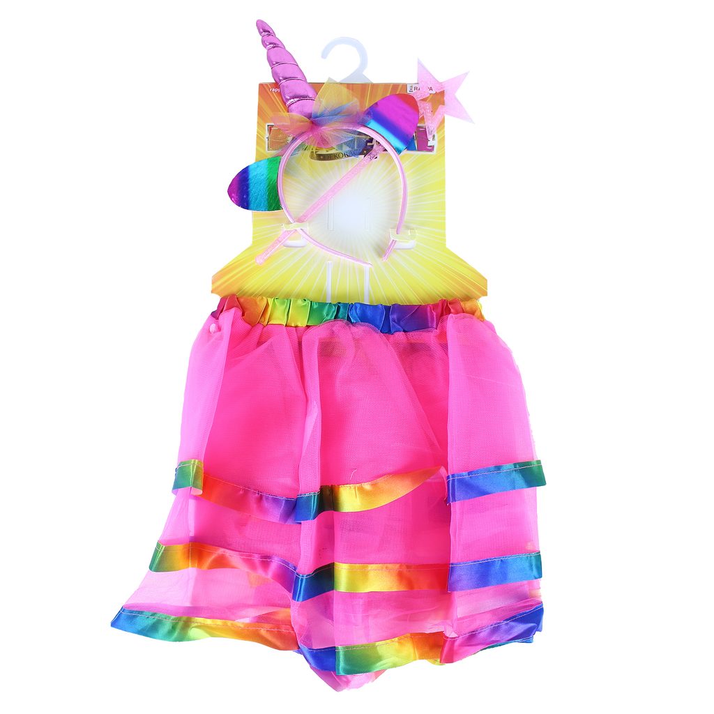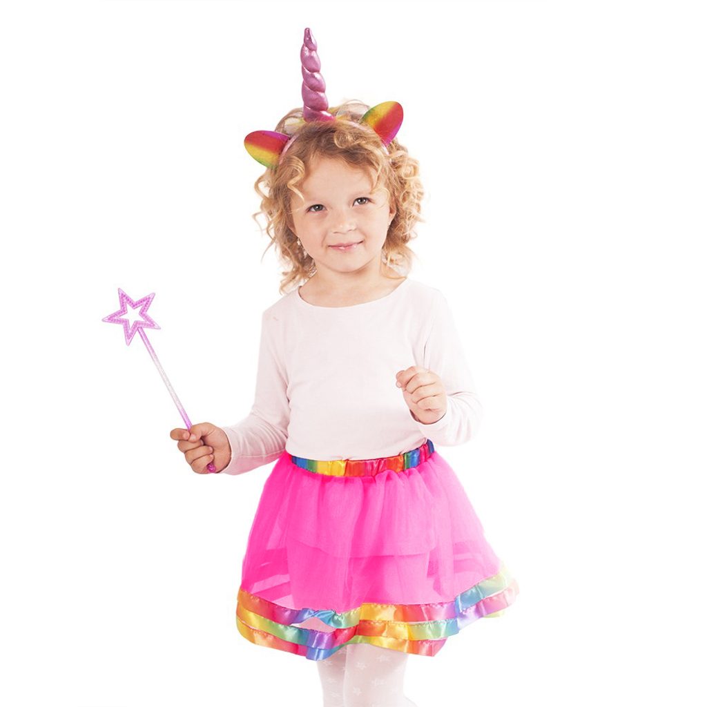 Roztomilá souprava pro všechny malé parádnice! Kostýmek v růžové barvě je určen pro holčičky ve věkovém rozmezí 3-6 let. Balení obsahuje nadýchanou sukničku zdobenou duhovým lemováním, perfektně sladěnou čelenku s rohem jednorožce a také hůlku. Délka sukýnky, která je v pase na gumičku je cca 31 cm.