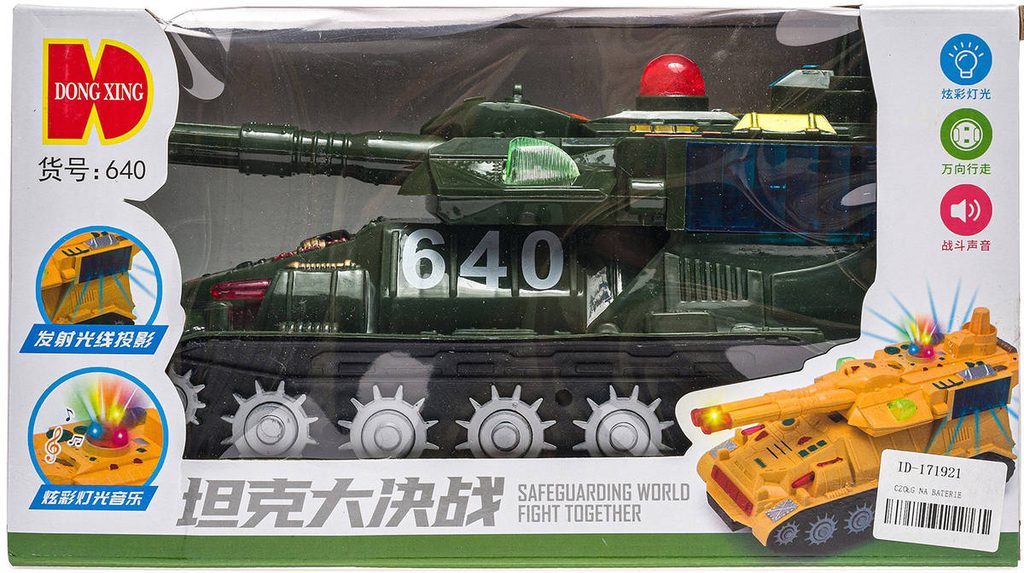 Po natažení setrvačníku nebo aktivaci tlačítka začne tank svítit a vydávat zvuk. Rozměry balení jsou zhruba 24 × 16 × 11 cm a hračka je určena pro děti od 3 let