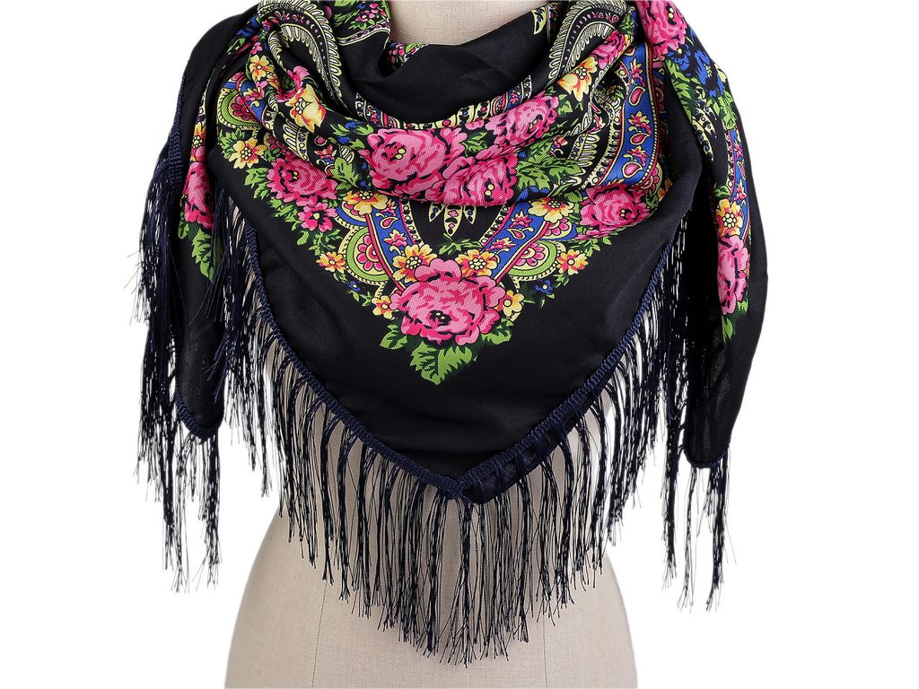 Šátek folklórní květy a třásněmi 105x105 cm