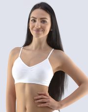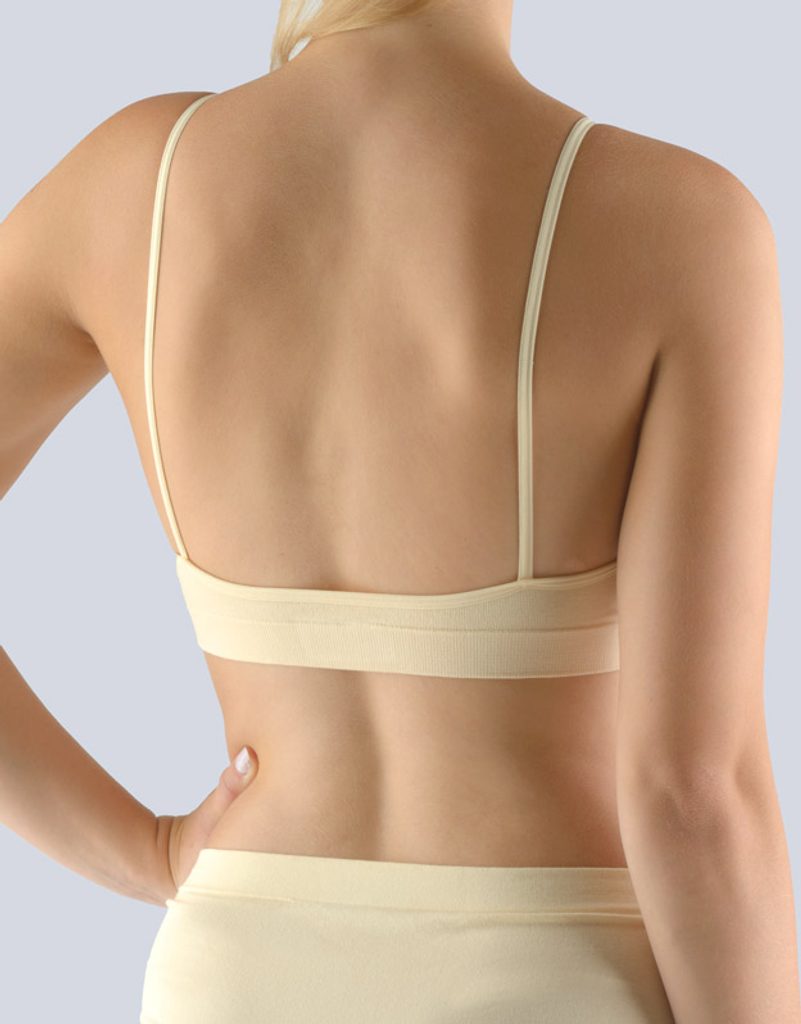Podprsenkový top s úzkými ramínky, dámské bezešvé prádlo. Dolní kraj je zesílený a zapravený bezešvým způsobem. Průramky a průkrčník jsou začištěny lemovacími proužky, které přechází do ramínek. Top je jednobarevný.
