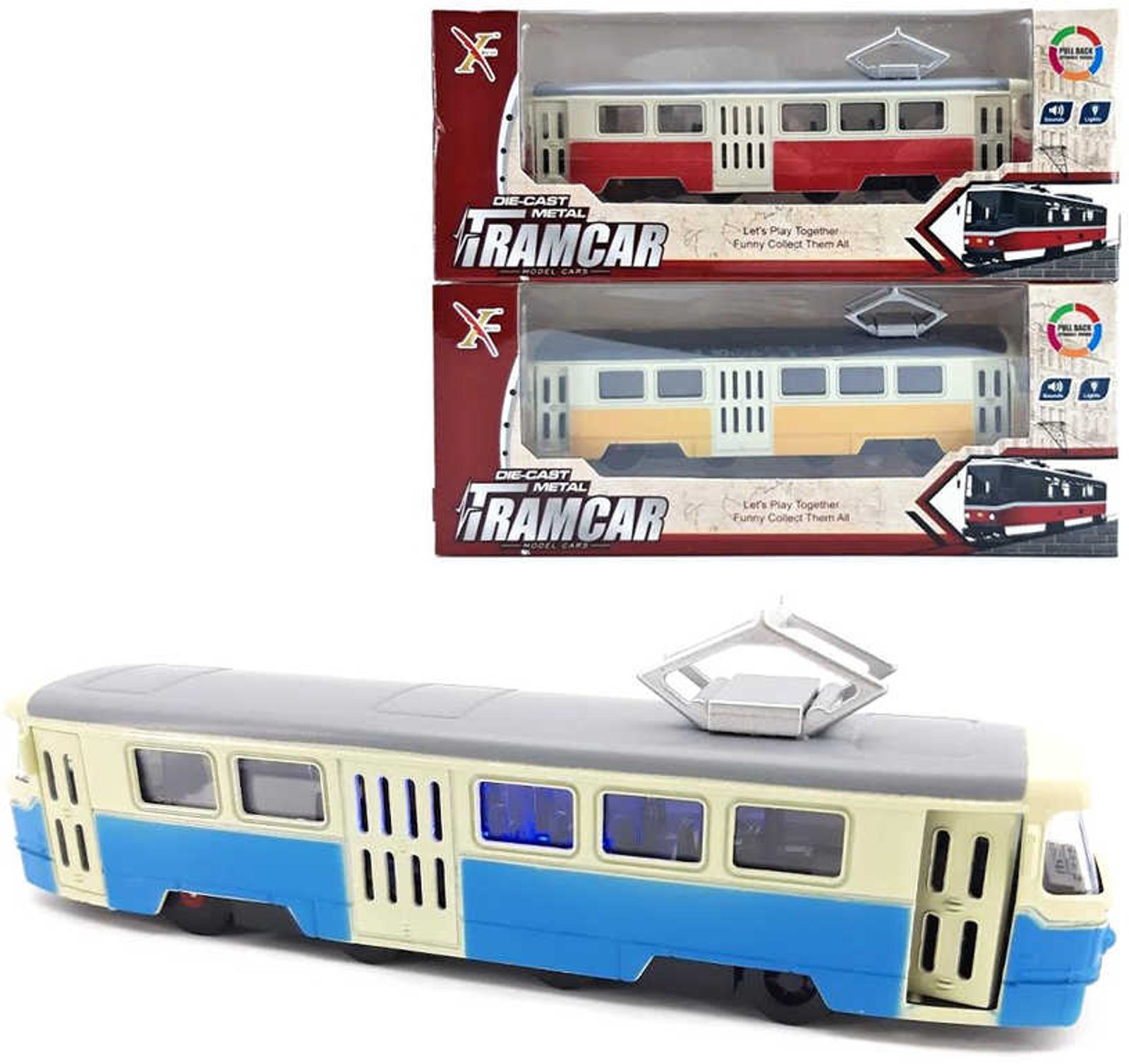 Tramvaj kovová s efekty 16cm na baterie zpětný chod Světlo Zvuk