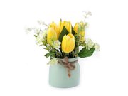 Umělé tulipány v květináči zútulní a rozjasní během jara a velikonočních svátků každý interiér. V květináči je 5 květů tulipánů a další drobné květy. Květináč je plastový, má dobrou stabilitu a zdobí ho jutový provázek.