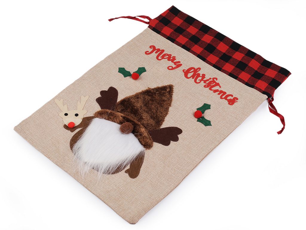Vánoční pytel si získá srdce všech dětí. Je vyrobený z imitace juty, na přední straně jej zdobí aplikace postavy se spoustou zajímavých detailů. Nahoře je ozdobený károvaným lemem. Hodí se nejen na zabalení dárků, ale i jako poutavá dekorace na Vánoce. Pohodlně se uzavírá pomocí saténových stahovacích šňůrek.