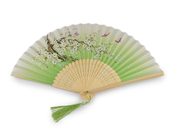 Textilní vějíř využijete na společenské události i na karnevaly. Zdobí ho květinový potisk s metalickými detaily. Má dřevěnou rukojeť s vyřezanými ornamenty. Dole je ozdobený střapcem.