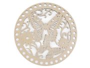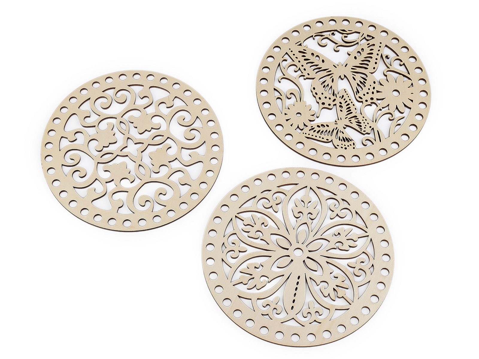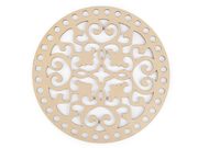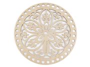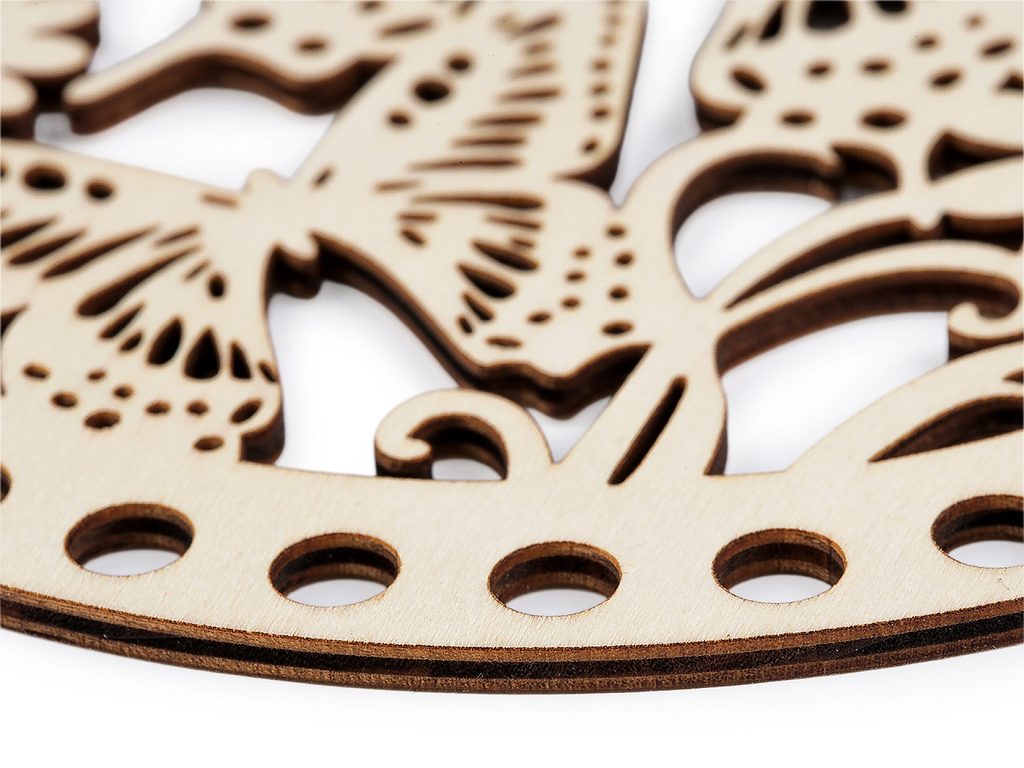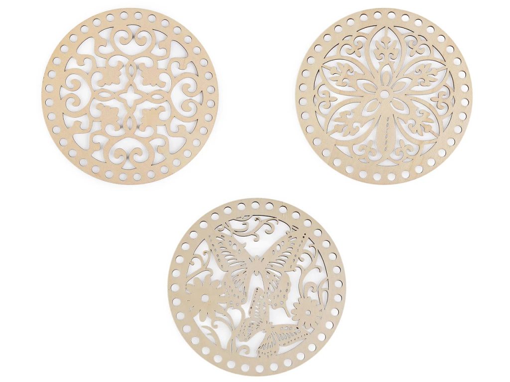 Dřevěný kruh s výřezy můžete použít jako víko pro háčkované košíky nebo jako stěny kabelky. Poslouží i na výrobu drhaných obrázků a závěsů. V neposlední řadě se dá využít i na výrobu lapačů snů a zvonkoher. Překližku můžete domalovat dle vlastní fantazie.