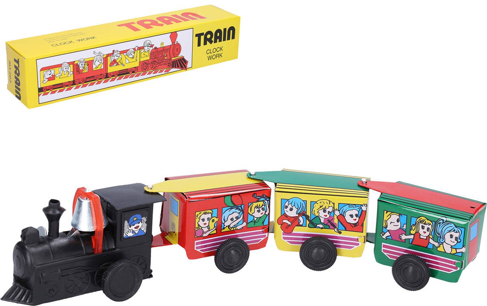 Vlak kovový 28cm natahovací na klíček mašinka + 3 vagony v krabici