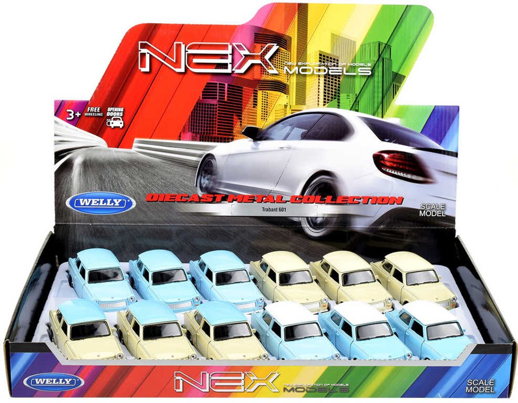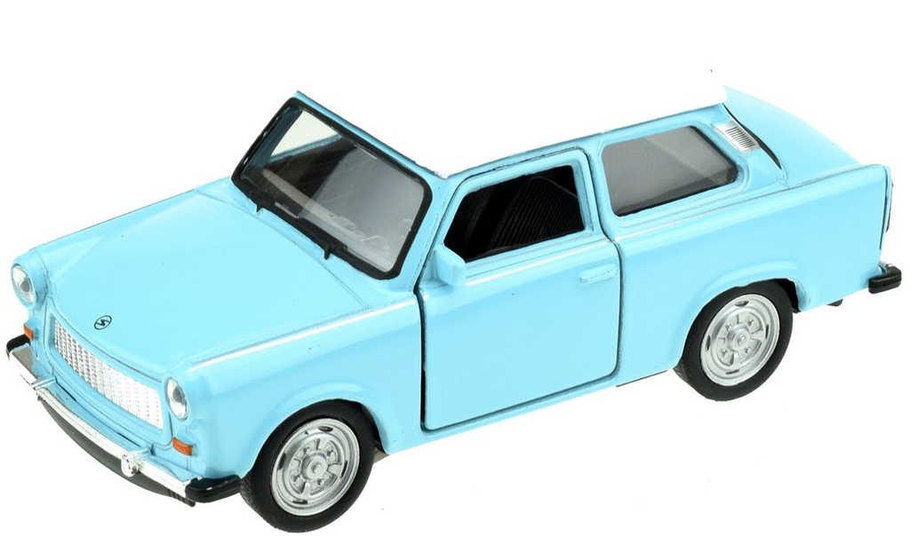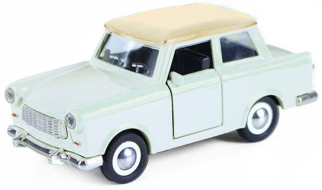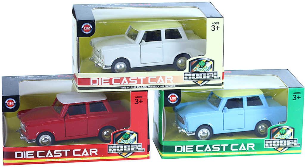 trabantem! Model ve čtyřech barevných kombinacích. Má otevírací dveře (dvířka lze otevírat). Vůz vyroben tlakovým litím z kovové slitiny v kombinaci s plastovými díly. Baleno v krabičce.