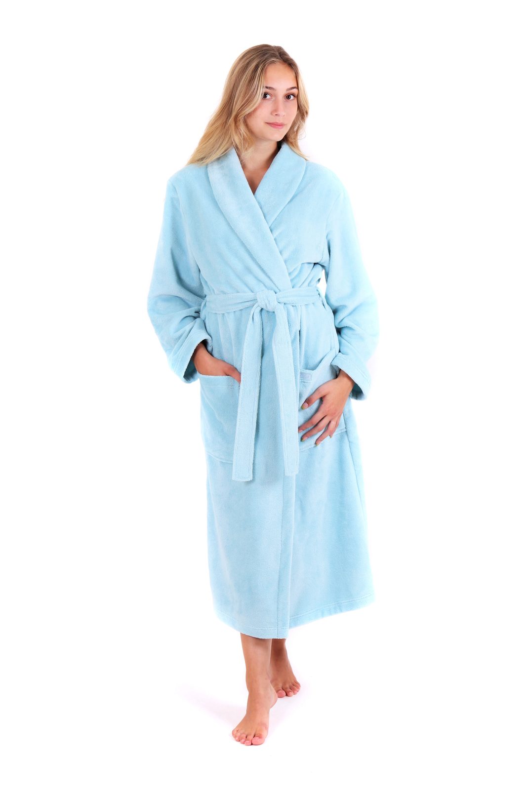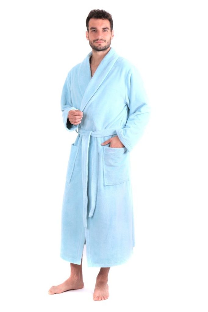 Dlouhý župan klasického střihu s šálovým límcem, velkými kapsami a se zavazováním na šňůrku.