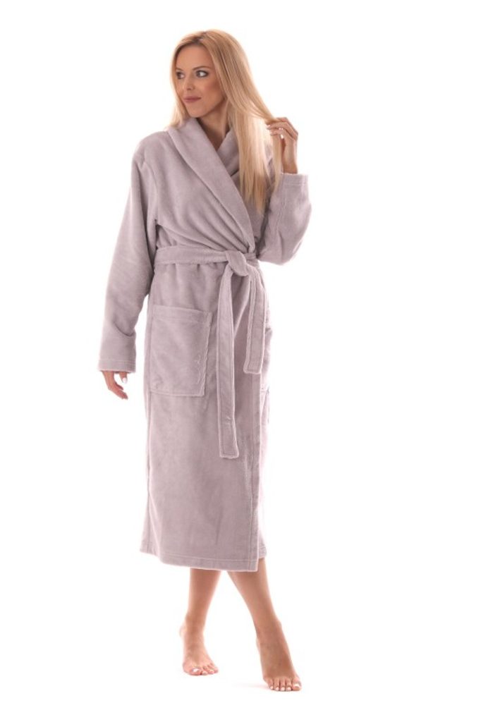 Dlouhý župan klasického střihu s šálovým límcem, velkými kapsami a se zavazováním na šňůrku.